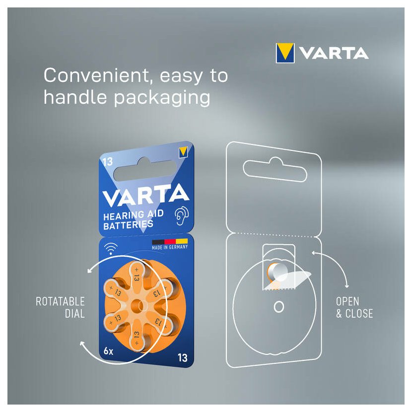 Baterie do sluchadel VARTA 13 představují prémiové řešení napájení pro všechny typy sluchadel, ať už klasických či nejmodernějších s připojením Bluetooth. Nabízejí spolehlivou, dlouhotrvající energii a stabilní napětí 1,45 V, které zajišťuje čistý a plynulý zvuk, a to i při bezdrátovém streamování nebo Bluetooth připojení.