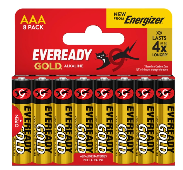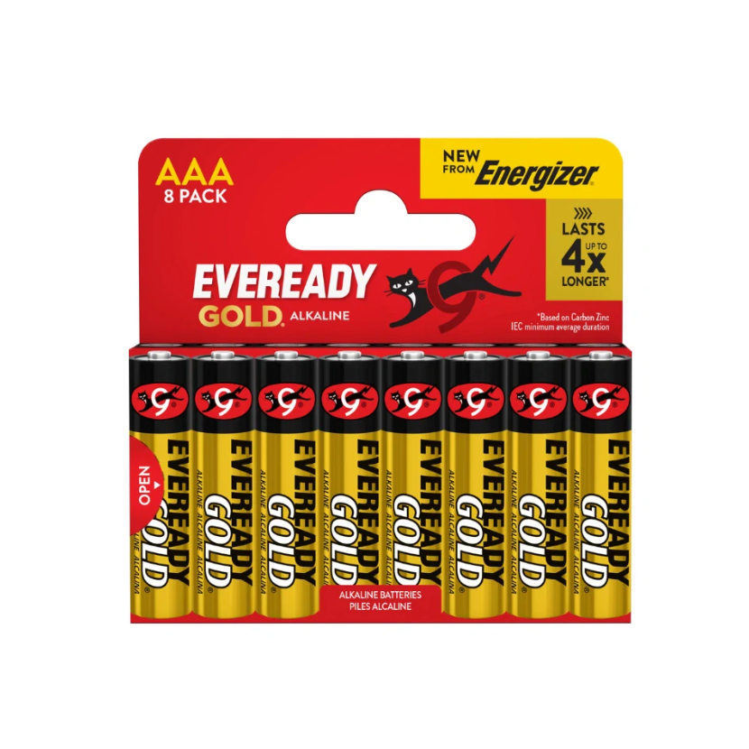 Alkalické baterie EVEREADY GOLD® jsou ideální pro zařízení s nízkou až střední spotřebou energie, jako jsou dálkové ovladače, rádia, kalkulačky, hračky, hlásiče kouře a další. Vyznačují se cenovou dostupností, dlouhou výdrží a konzistentním výkonem.