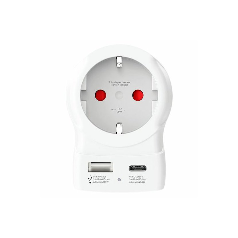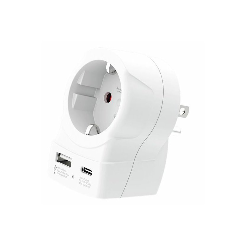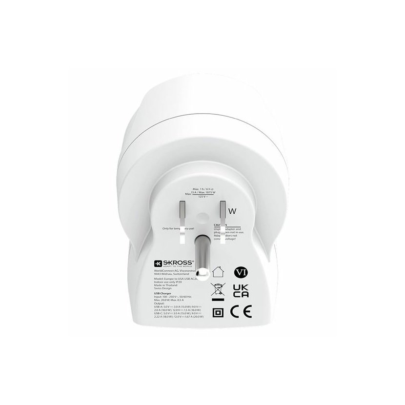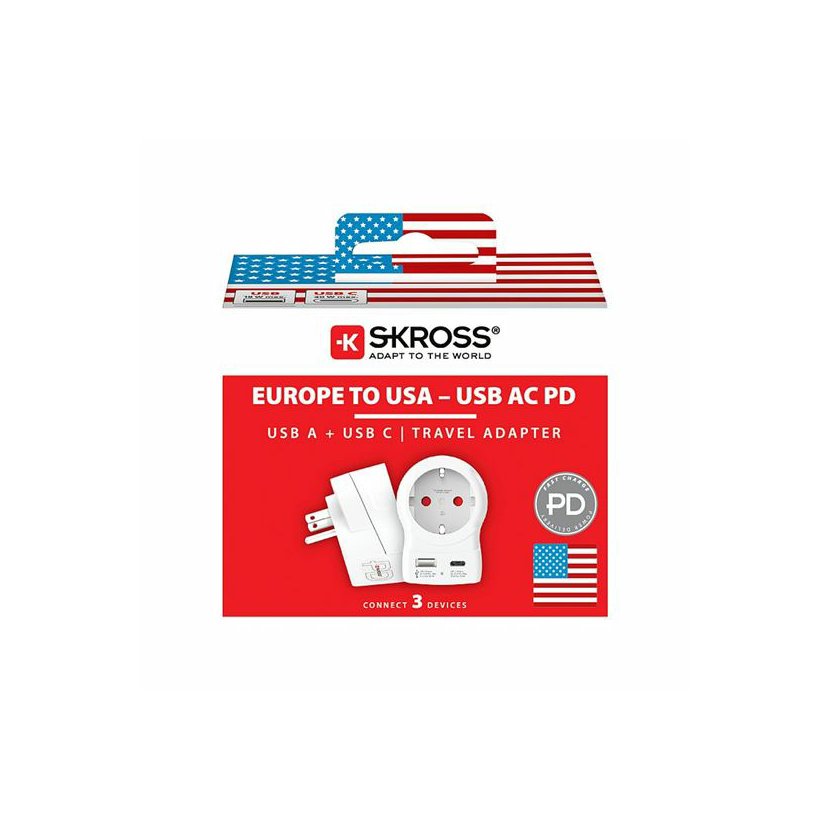 Adaptér SKROSS Europe to USA USB AC20PD umožňuje bezpečné použití evropských zařízení v zásuvkách Spojených států a zemích s USA standardem (typ B). Připojí uzemněné i neuzemněné vidlice přívodních kabelů, bez problémů zapojíte vše od notebooků až po fény.