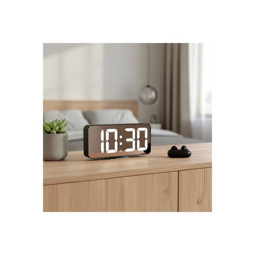 Tyto moderní hodiny automaticky synchronizují čas přes Bluetooth bez nutnosti aplikace. LED displej umožňuje přepínání mezi časem a teplotou. Tři úrovně jasu a automatická regulace jasu v nočním režimu zajistí pohodlné používání i v noci. Napájení poskytují tři mikrotužkové baterie nebo USB adaptér DC 5 V 300 mA (USB kabel součástí balení, adaptér nikoli).