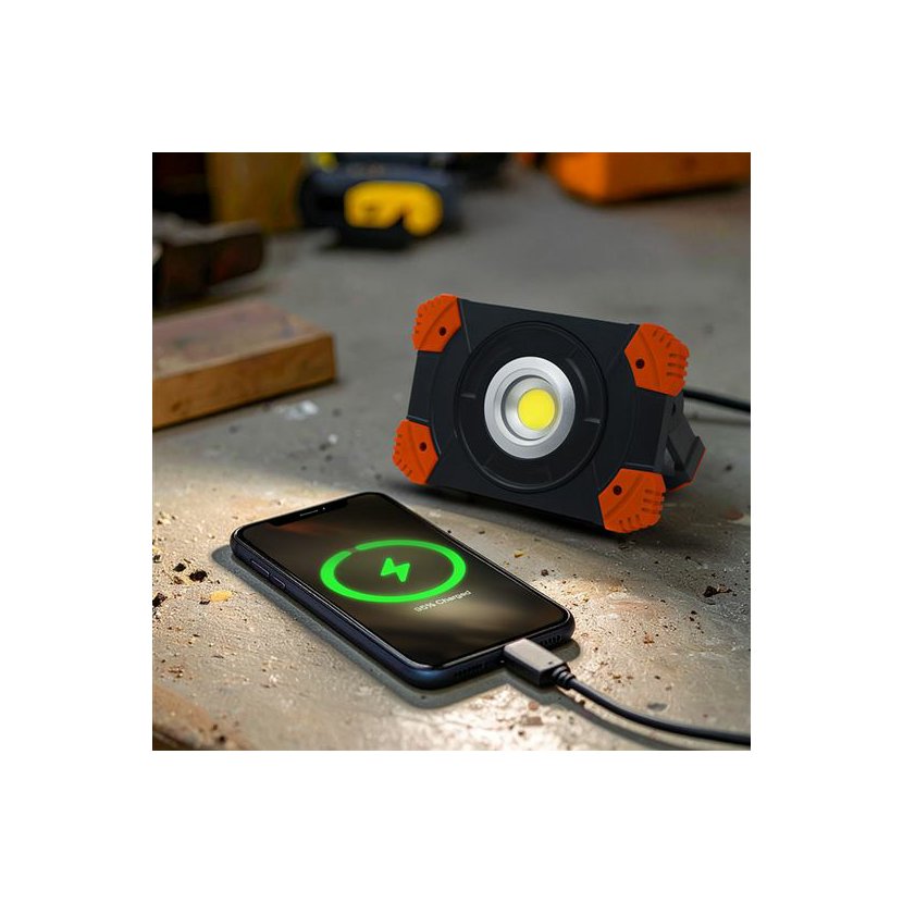 Reflektor je nabíjecí, uživatel tedy není závislý na energii ze sítě a může ho použít prakticky kdekoliv. Napájení poskytuje zabudovaný Li-Ion akumulátor 3.7 V 4400 mAh s výdrží až 4 hodiny. Na boční straně reflektoru se nachází ukrytý USB-C konektor. Součástí balení je přiložený kabel USB-A/USB-C, pomocí kterého se reflektor nabíjí. Nabíjení zcela vybitého reflektoru zabere zhruba 4 hodiny. Kromě konektoru USB-C je k dispozici také konektor USB-A, který umožňuje využít reflektor jako powerbanku. V případě nouze si tak můžete nabít třeba mobil.