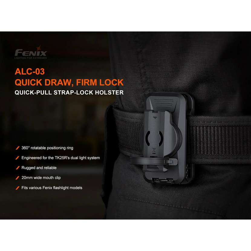 Držák lze použít k uchycení kapesních svítilen vybavených sponou jako jsou Fenix PD36R PRO, PD36R ACE, PD35R ACE, TK16, TK17, TK21R a další. Držák se na opasek uchytí prostřednictvím masivního klipu a lze jej ještě zajistit drátěným pérkem. Díky natáčecímu držáku lze svítilnu otáčet v rozsahu 360°.