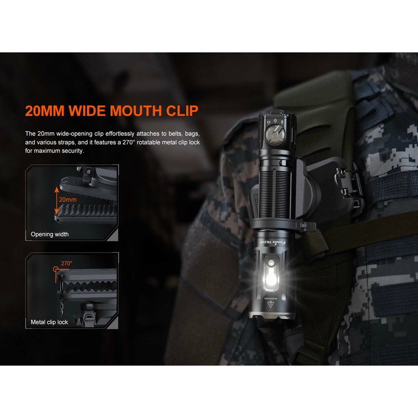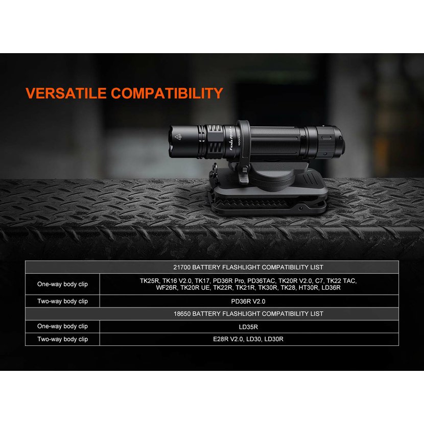 Lze použít k uchycení kapesních svítilen vybavených sponou jako jsou Fenix HT30R, LD36R, PD36R PRO, PD36R ACE, PD35R ACE, TK16, TK17, TK20R UE, TK21R, TK22R, TK25R, TK28R, TK30R