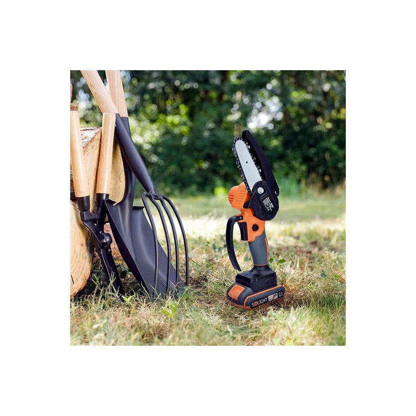 Lehká, ruční akumulátorová řetězová pila s bezuhlíkovým motorem, Solight RNP150, délka lišty 150 mm, řezná rychlost 5 m/s, integrovaná ruční olejová pumpa