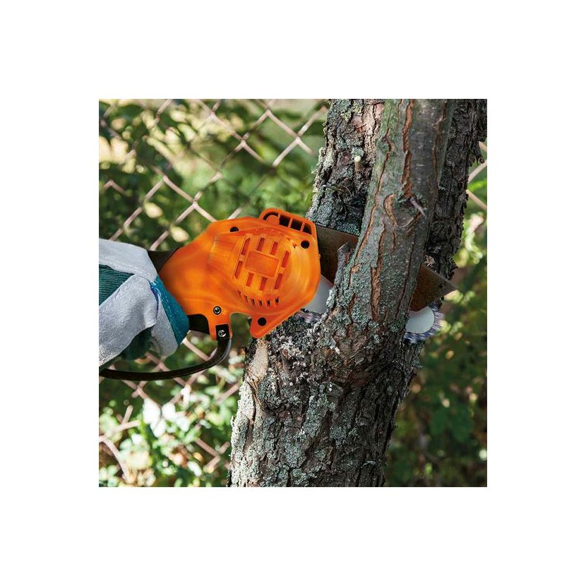 Pila je vybavena bezpečnostními prvky, které zajišťují vyšší ochranu při práci - pojistkou proti nechtěnému spuštění a ochranným krytem řetězu. Protiskluzová rukojeť zajišťuje komfortní a bezpečné držení i při delším používání.