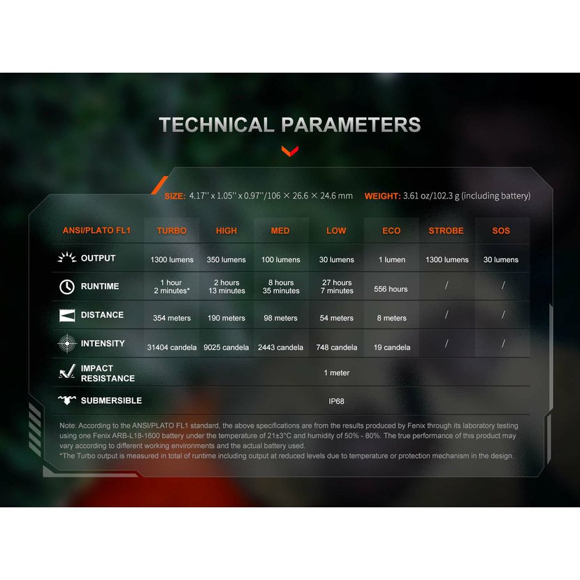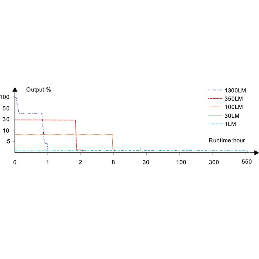 Všechny parametry svítilny (světelný tok, doba provozu na baterie, vodotěsnost, dosvit a nárazuvzdornost) jsou změřeny v souladu s normou ANSI/NEMA FL 1-2009.