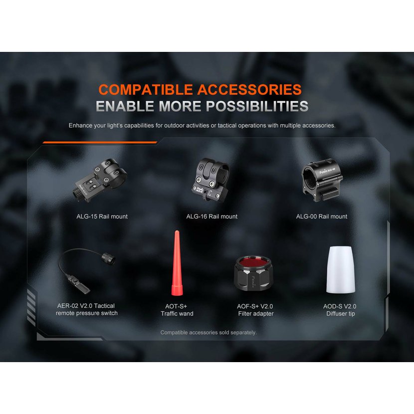Jako volitelné příslušenství lze například dokoupit: kabelový spínač Fenix AER-02, červený dopravní kužel AOT-S+, difuzér AOD-S, červený filtr AOF-S+ V2.0, popruh Fenix ALD-05 pro použití svítilny na přilbě, držák Fenix ALB-10 na kolo či držák svítilny na cyklistickou přilbu BikeBlock, rychloupínací montáž Fenix ALG-00, rychloupínací montáž na lištu ALG-15, kovovou magnetickou montáž, pouzdro ALP-10S, montáž na M-LOK Fenix ALG-16.