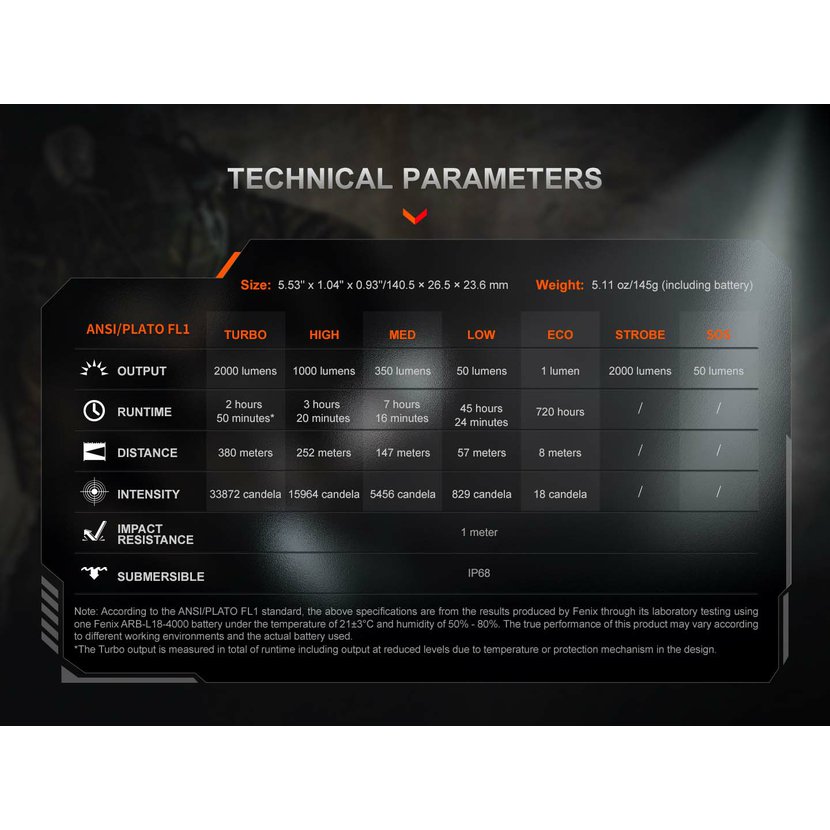 Všechny parametry svítilny (světelný tok, doba provozu na baterie, vodotěsnost, dosvit a nárazuvzdornost) jsou změřeny v souladu s normou ANSI/NEMA FL 1-2009.