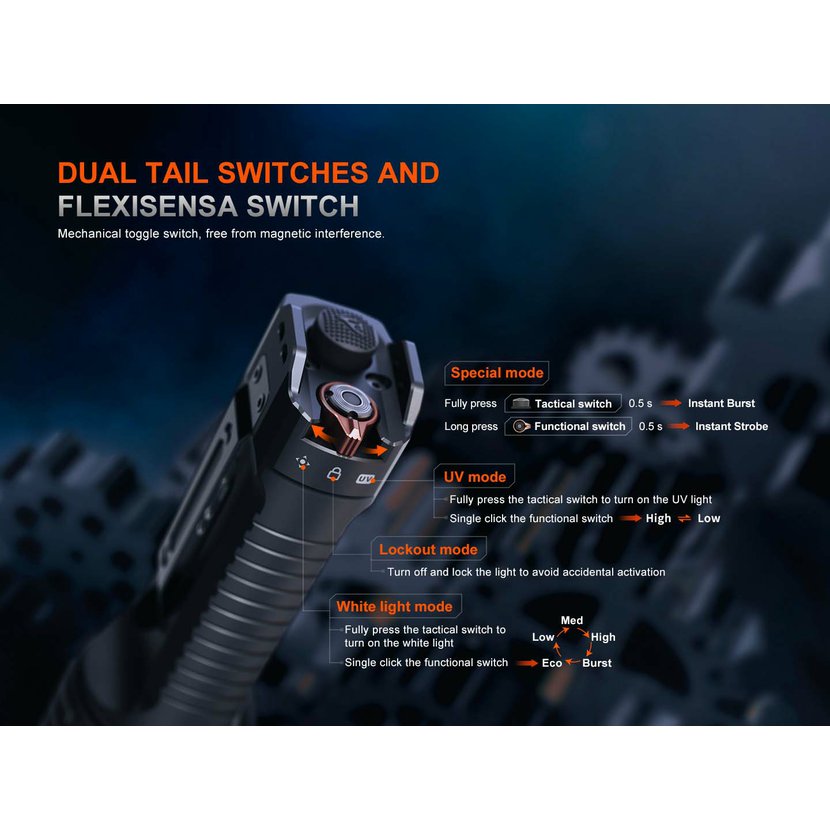 Ovládání je intuitivní a bleskurychlé díky taktickému spínači a inovativní přepínací páčce FlexiSensa control. Ta umožňuje nejen uzamčení svítilny proti nechtěné aktivaci, ale i volbu mezi bílým a UV světlem.