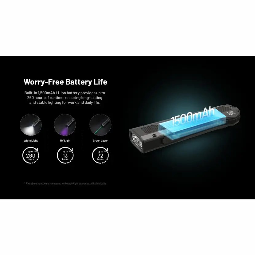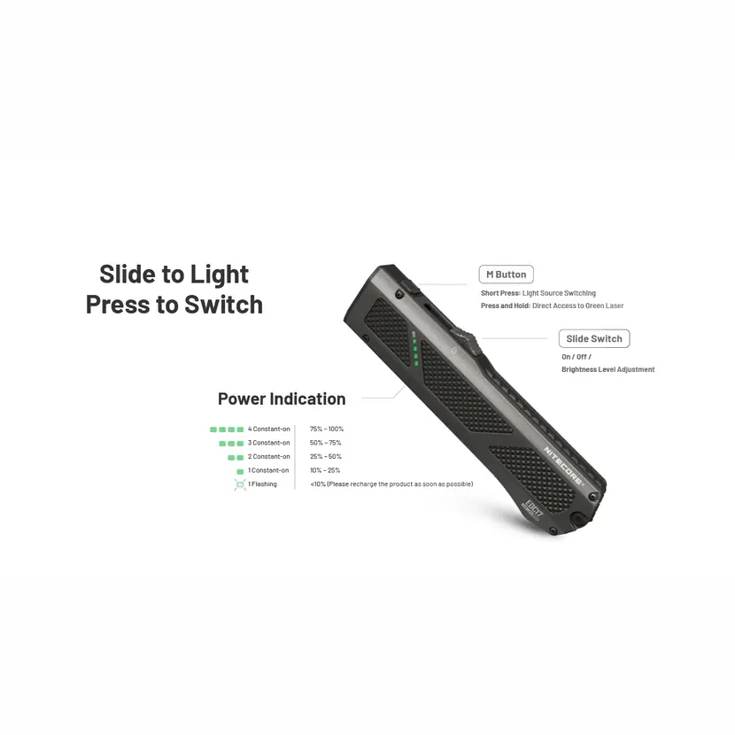 Ovládání je intuitivní díky dvěma tlačítkům – tlačítko "M" slouží k přepínání mezi bílým světlem, UV světlem a laserem, posuvným tlačítkem aktivujete svítilnu a volíte intenzitu světla.