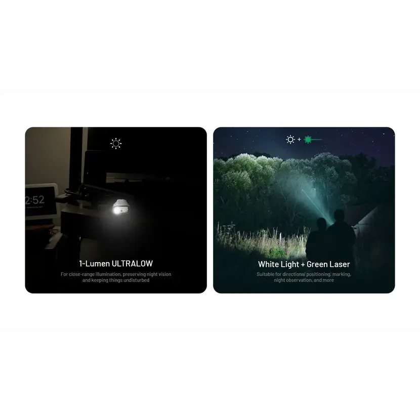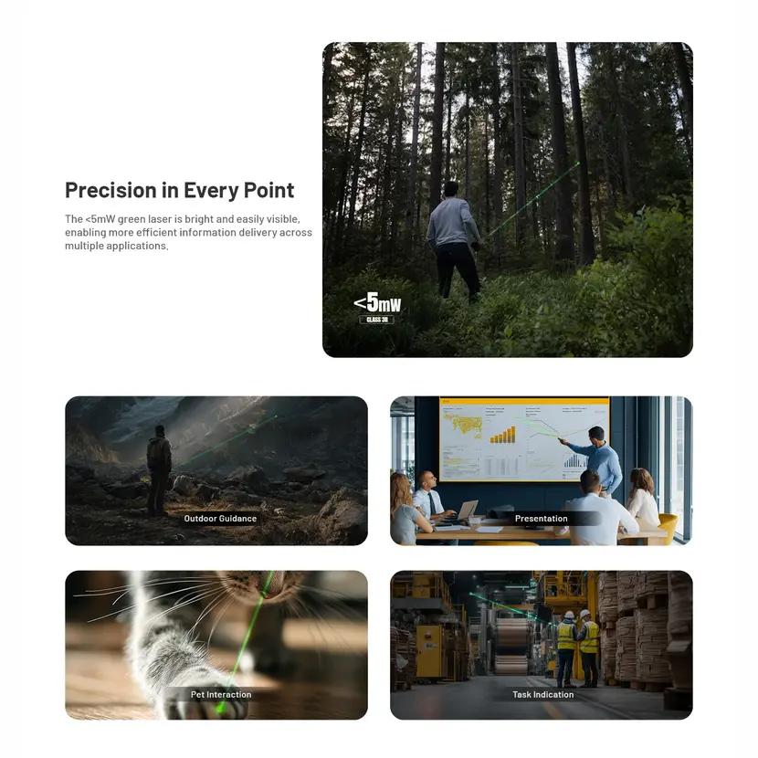 Zelený laser s výkonem <5 mW a délkou provozu až 72 hodin je dobře viditelný a skvěle poslouží při prezentacích jako ukazovátko, navigaci v terénu a dalších činnostech; lze jej používat také v kombinaci s bílým světlem.