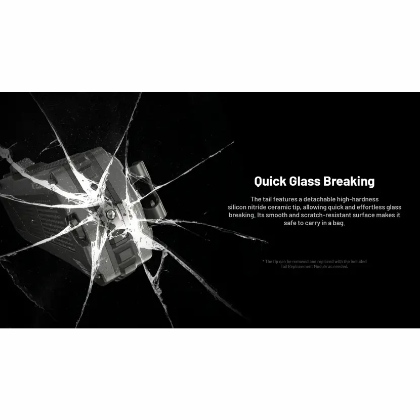 Pro maximální bezpečnost je svítilna vybavena keramickým hrotem, který umožňuje rychlé rozbití skla v krizových situacích.