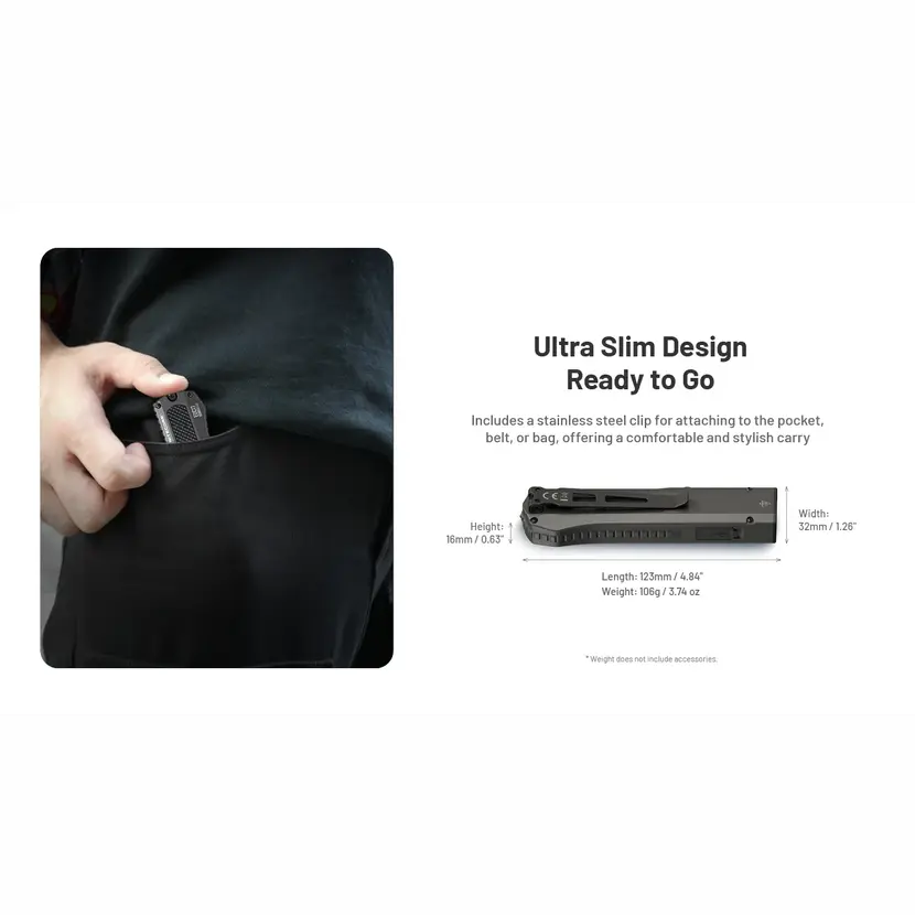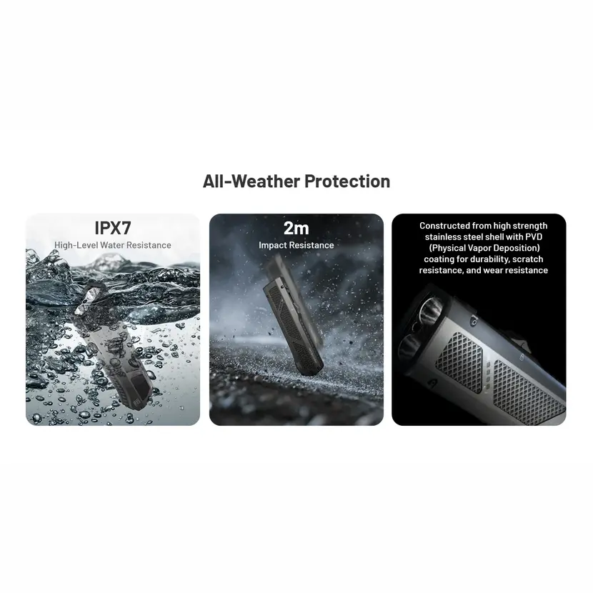 Svítilna EDC17 je vyrobena z vysoce odolné nerezové oceli s povrchovou titanovou úpravou, která zajišťuje dlouhou životnost a odolnost proti poškrábání i opotřebení. Díky zdrsněnému povrchu neklouže ani při použití v rukavicích. Splňuje standard odolnosti IPX7 zaručující ochranu při kontaktu s vodou, a zároveň odolá pádům z výšky až 2 metrů. Praktický klip umožňuje snadné uchycení ke kapse, opasku nebo batohu, součástí balení je také poutko.