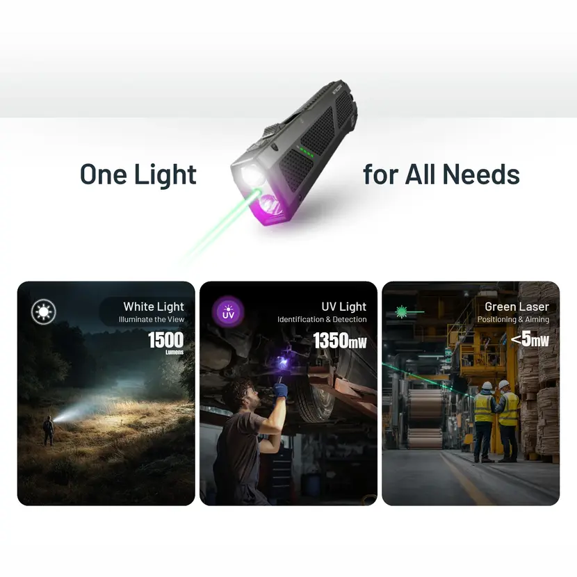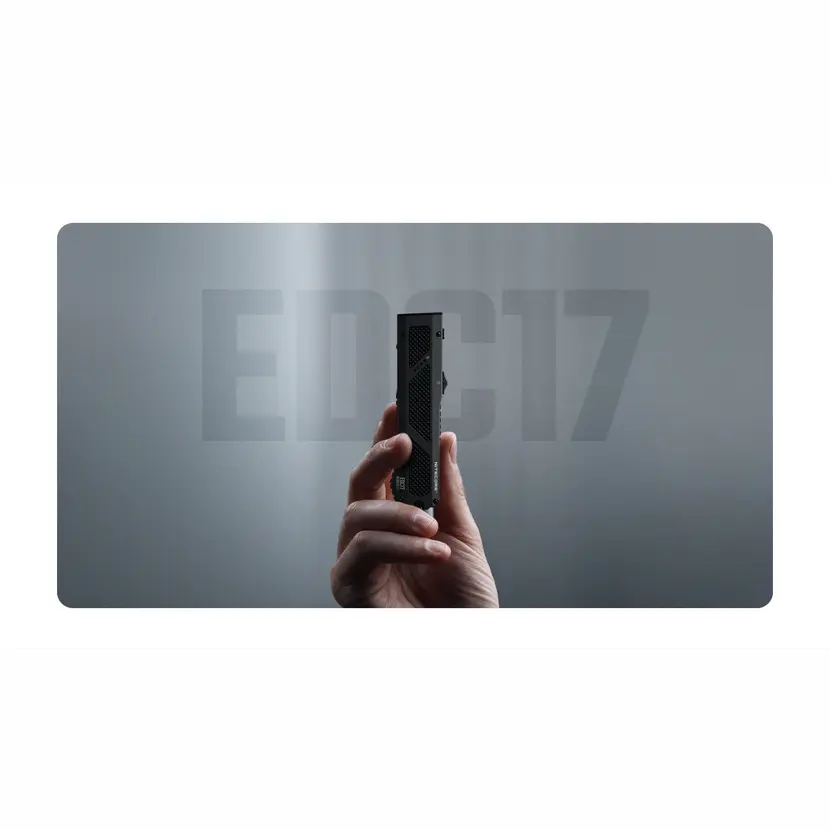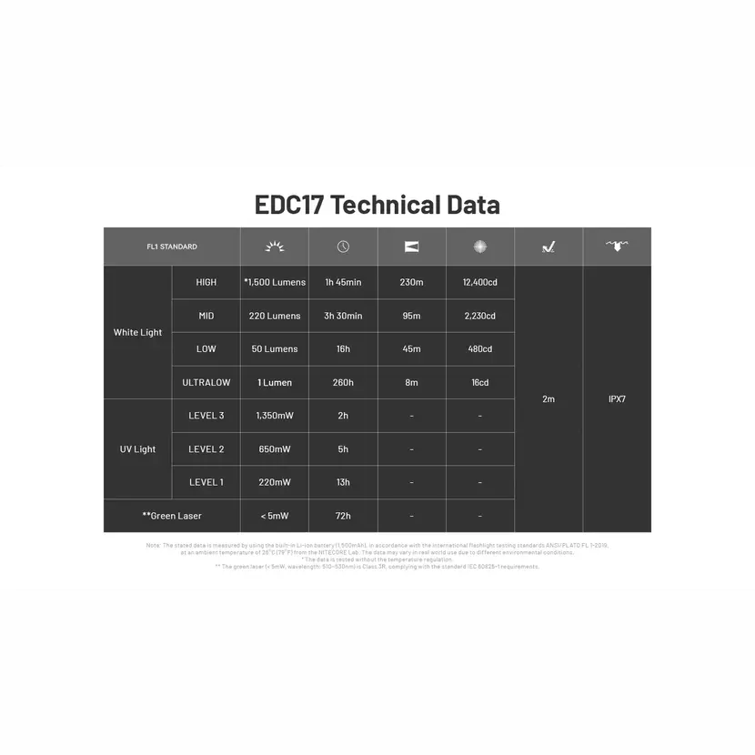 Svítilna Nitecore EDC17 o hmotnosti pouhých 106 g nabízí maximální světelný výkon až 1500 lumenů a dosvit až 230 metrů. Díky kombinaci bílého světla, UV světla a zeleného laseru je ideálním pomocníkem pro každodenní nošení, práci i outdoorové aktivity.