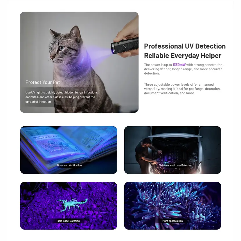 UV světlo se třemi úrovněmi výkonu (1350 mW, 650 mW a 220 mW, až 13 hodin svícení) je ideální např. pro ověřování dokumentů nebo rychlou detekci skrytých plísňových infekcí, ušních roztočů a dalších kožních problémů u domácích mazlíčků.