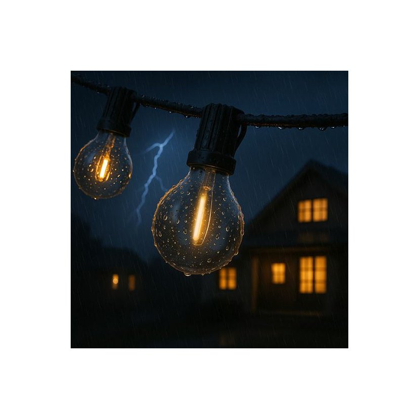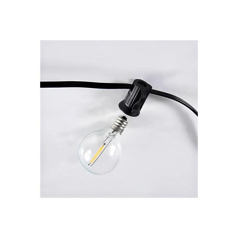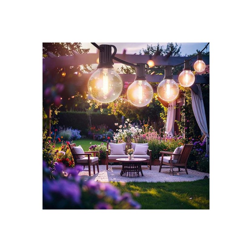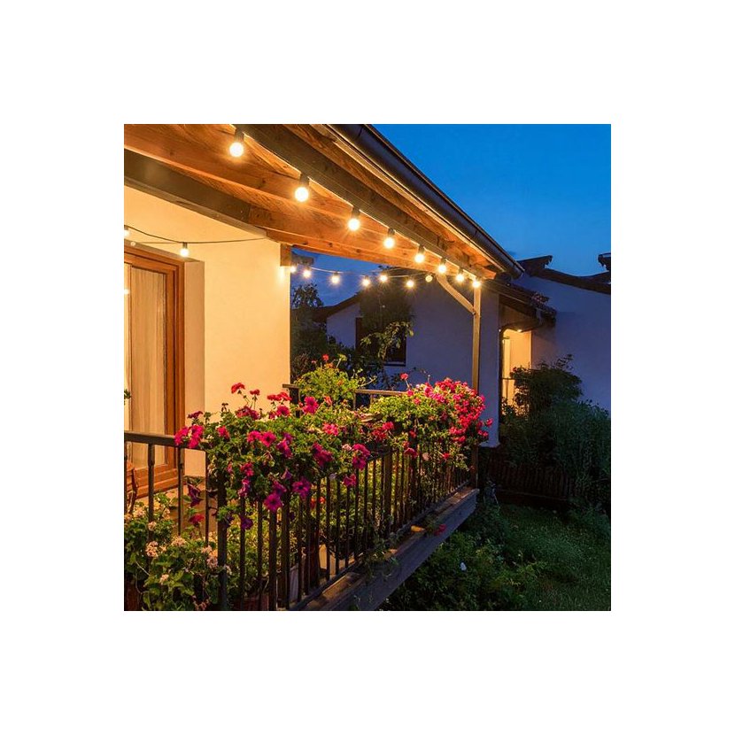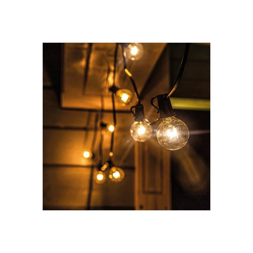 Stylový LED venkovní řetěz o délce 15 metrů (+ 5 metrů přívodní kabel) s vyměnitelnými G40 žárovkami přináší příjemnou atmosféru do každého exteriéru i interiéru.
