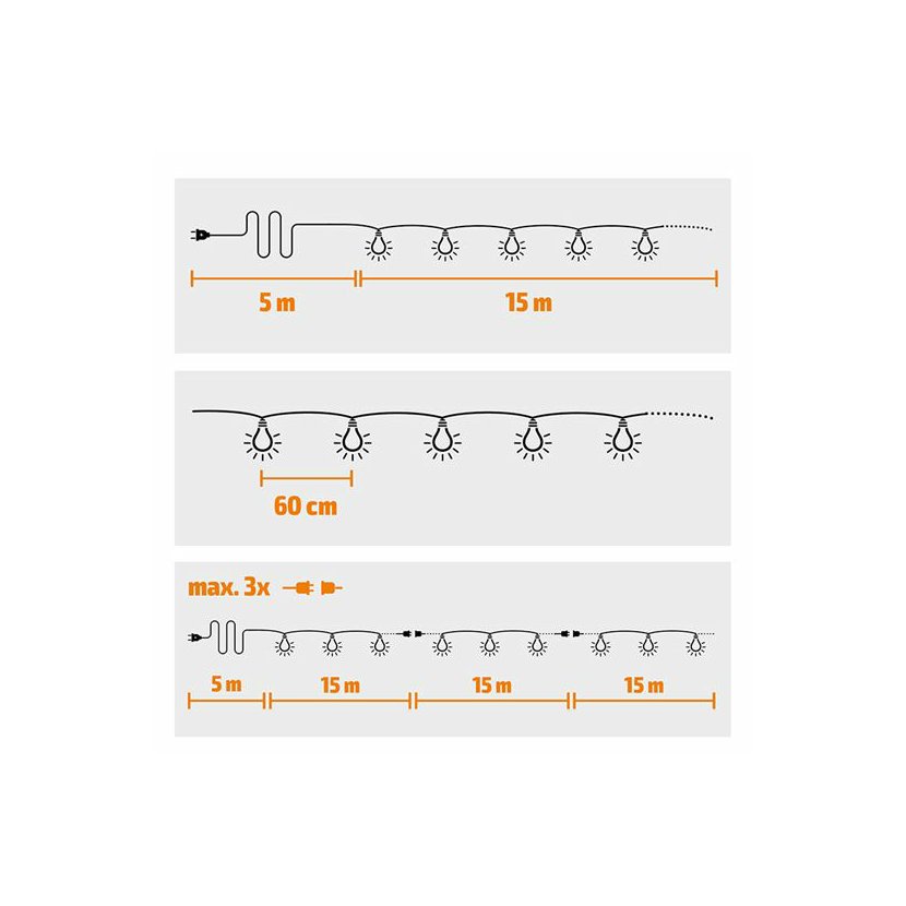 Řetěz obsahuje 25 LED žárovek rozmístěných od sebe 60 cm a poskytujících teplé bílé světlo (3000 K) s intenzitou 30 lm. Celkový příkon činí 9 W, světelný tok dosahuje 750 lumenů, čímž je zajištěno decentní, ale dostatečné osvětlení například pro zahradní posezení, pergolu nebo terasu.