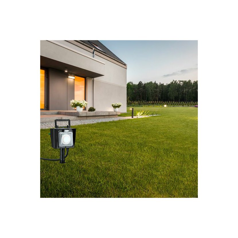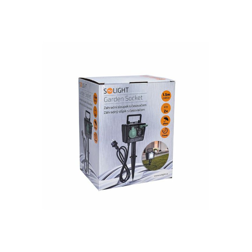 Je vybaven dvěma zásuvkami s krytkami, které chrání před vlhkostí, prachem i nečistotami. Díky stupni krytí IP44 odolá stříkající vodě a je vhodný pro venkovní prostředí. Hrot ve spodní části umožňuje snadné zapíchnutí do země a stabilní upevnění.